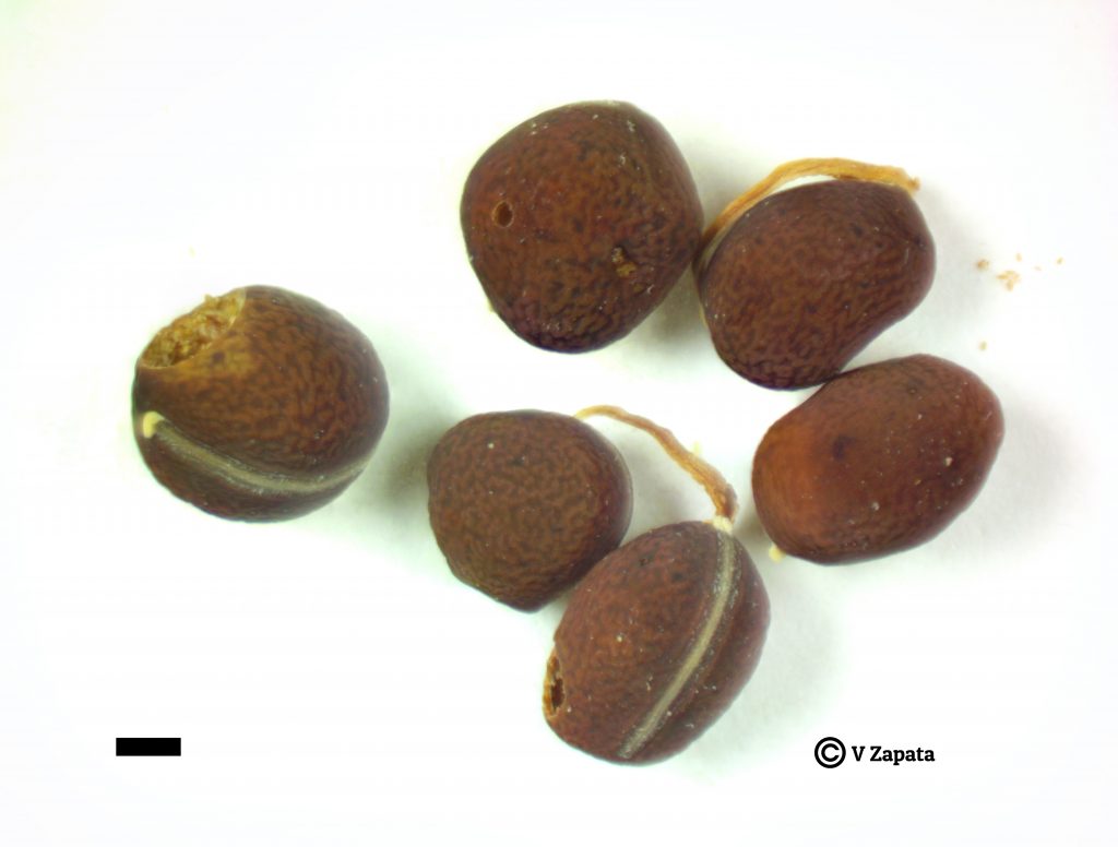 Fruto 25-33 x 6-7,5 mm, oblongo u oblongo-elíptico, comprimido, estipitado, glabrescente, con 2-4 semillas; estípite 2-3 mm. Semillas 3,5-4 mm, esferoidales o elipsoidales, ligeramente comprimidas, lisas, de color sepia, pardo claro o pardo rojizo, con manchas más obscuras; hilo 5-6 mm, 1/2- 3/5 del contorno de la semilla.